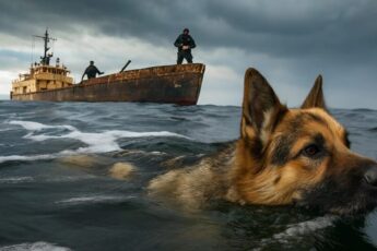 The German shepherd was swimming alone in the middle of the wide ocean when the sailors noticed it, but