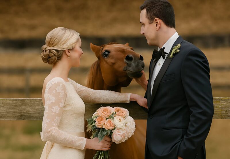 From early that morning, I had been filled with joy, because I had always dreamed that my beloved horse would appear in our wedding photos — my most loyal friend. She was gentle, obedient, affectionate, and I trusted her more than anyone else. This horse had been a gift from my late father, so she held a very special place in my heart.