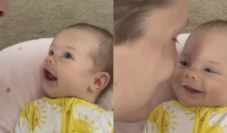 As the camera captures the scene, we witness the baby’s innocent face light up with a mixture of surprise and delight. Her eyes widen, and a captivating smile spreads across her face, revealing the sheer happiness that courses through her tiny being. It’s as if this gentle display of affection from her dad has awakened a profound sense of warmth and security within her.
