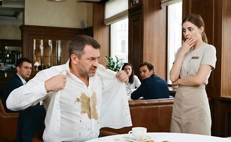 Anna was carrying a tray of coffee to the table where the owner was sitting. The passage was narrow, and just as she was about to set the cup down, he suddenly turned around without looking. His elbow hit the tray, the glass tipped over, and the hot coffee spilled right onto his white shirt.